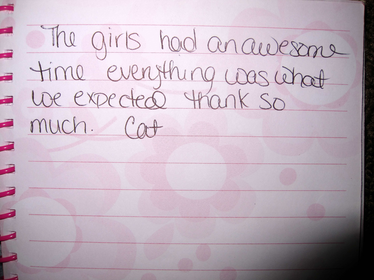 "The girls had an awesome time everything was what we expected thank so much. Cat." Cat, New Jersey (handwritten note)