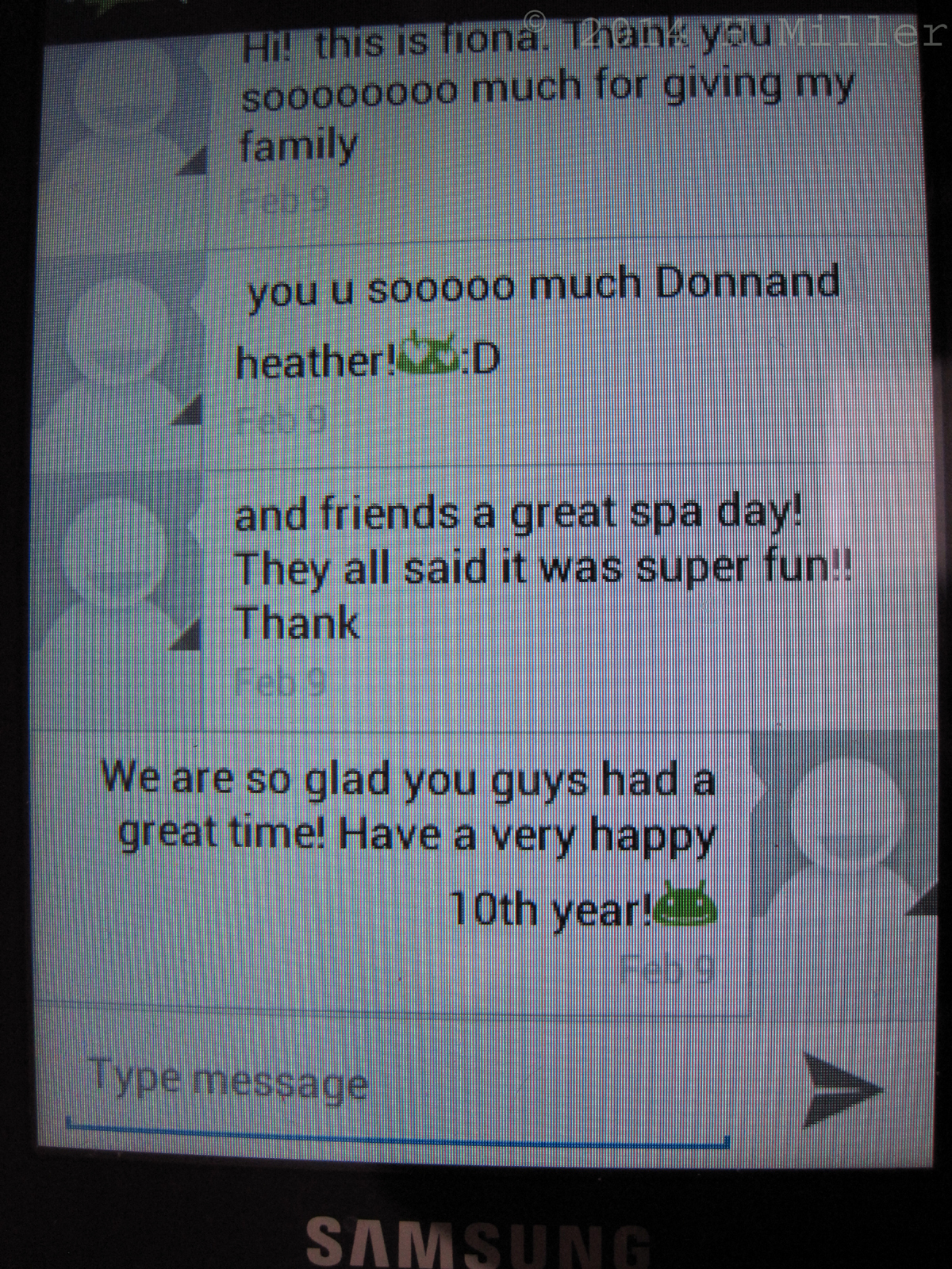 "Hi, this is Fiona. Thank you soooooooo much for giving my family and friends a great spa day! They all said it was super fun!! Thank you sooooo much! :D" Fiona, Newark, NJ, Kids Hotel Spa Party, 2-8-2014 (received by text)