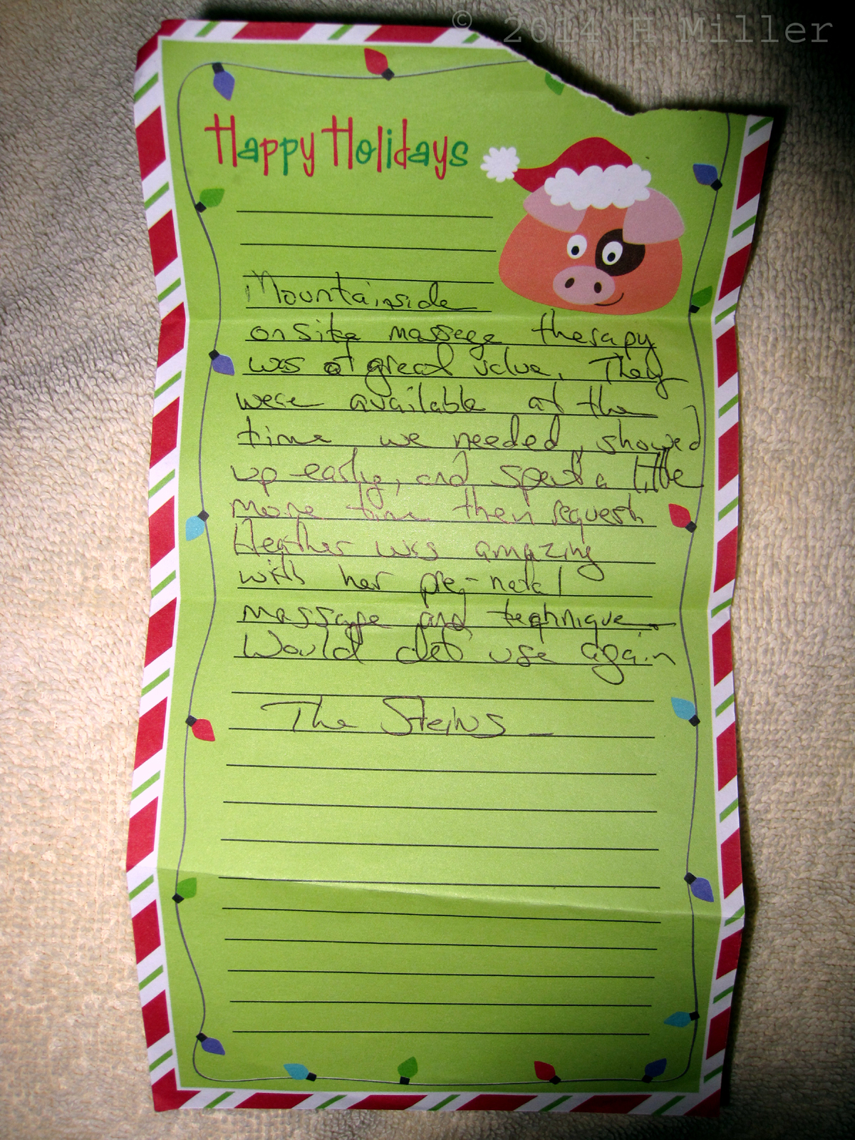 "Mountainside On Site Massage Therapy was of great value. They were available at the time we needed, zghowed up early, and spent a little more time. Heather was amazing with her prenatal massage and technique. Would def use again. The Steins. " 2-2014 (handwritten note)